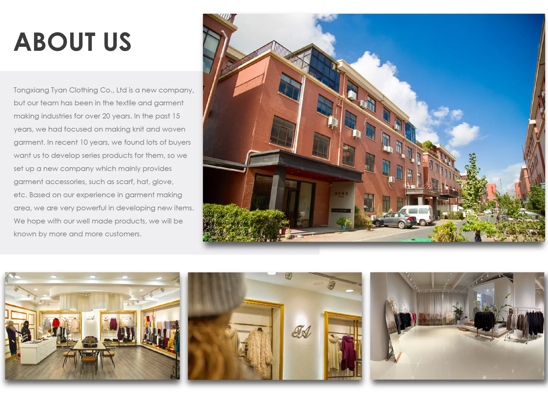 Productos principales:Ropa, Suéter de punto, Prendas de piel, Prendas de cuero, Guantes, Bufandas y Sombreros
