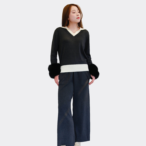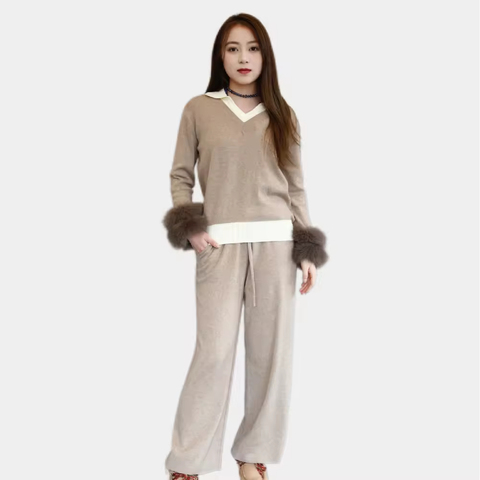 Mulheres Malha 2pc Set V Neck Sweater Fox Fur Cuffs Calças de malha Inverno Outfit Cozy Loungewear